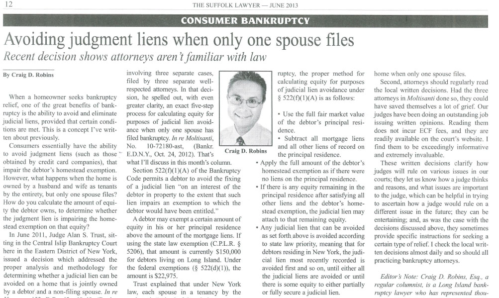 Mr. Robins is a regular columnist on bankruptcy law for the Suffolk Lawyer (the official publication of the Suffolk County Bar Association) where he has written for over 18 years. He also frequently writes articles for the Nassau Lawyer (the official publication of the Nassau County Bar Association), as well as the Attorney of Nassau.
